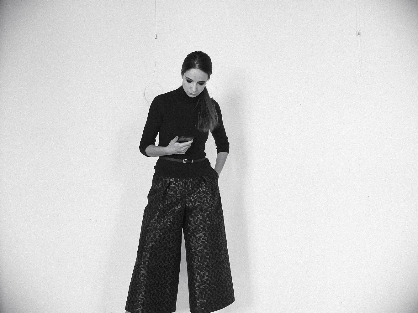 ::::In draping, making the pattern and sewing this pair (I am calling them “Galleria”, i.e. gallery because they did feel “at home” in the art gallery where I took the pictures …) I tried to mantain as much as I could the skirt appearance while keeping at a minimum the fullness. The fabric is quite unusual, rather stiff and with a crisp hand = lots of built in drama already! I felt that adding too much fullness would have pushed the whole thing over the top (think ball gown). I wanted them to have an architectural silhouette yet be wearable… ok … maybe not at the mall.::