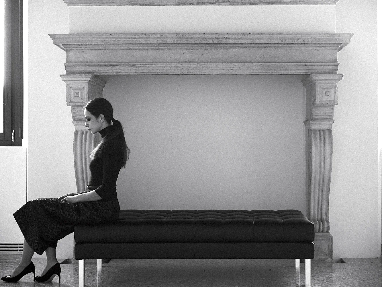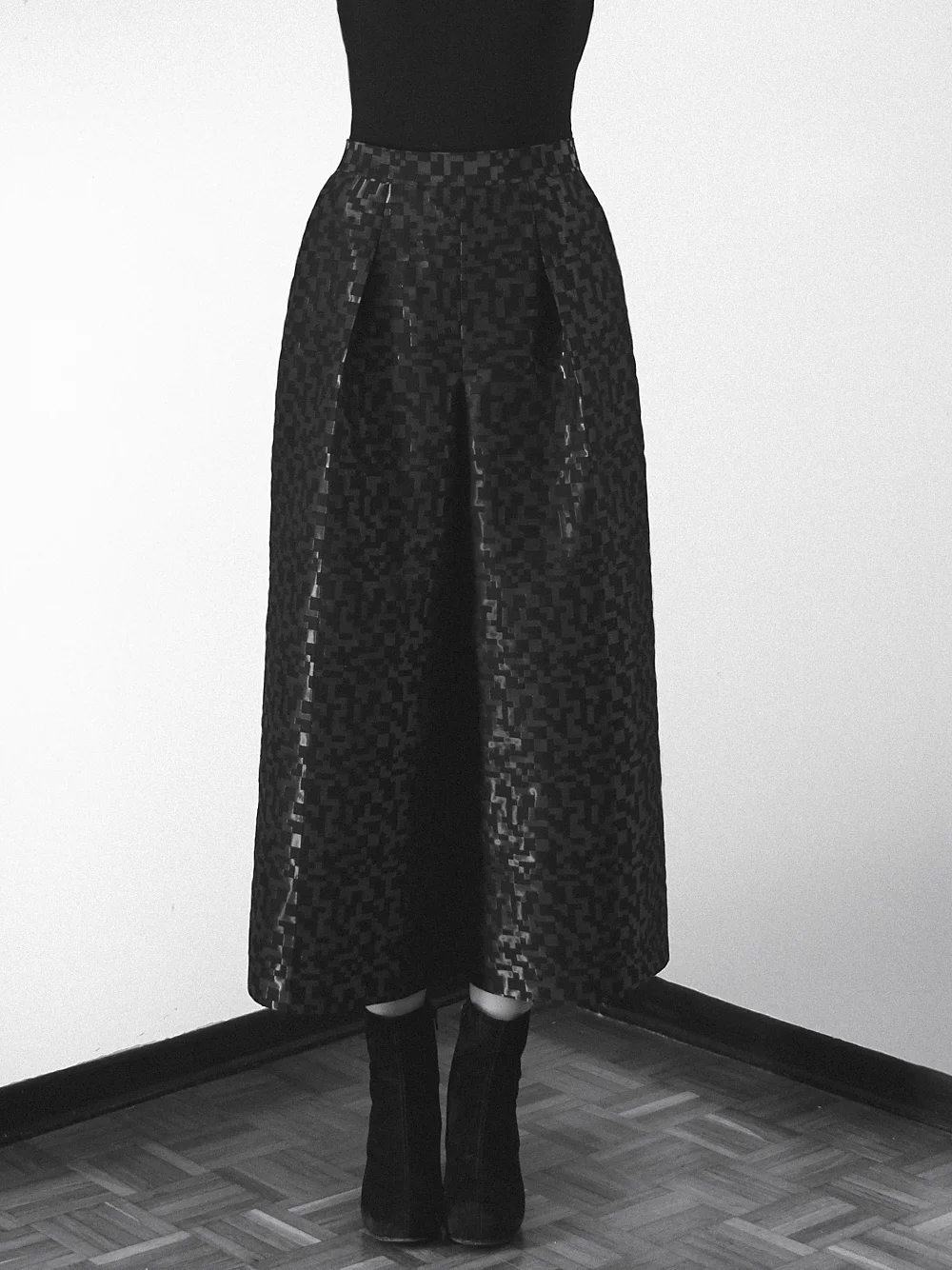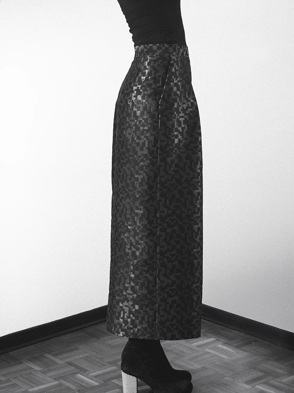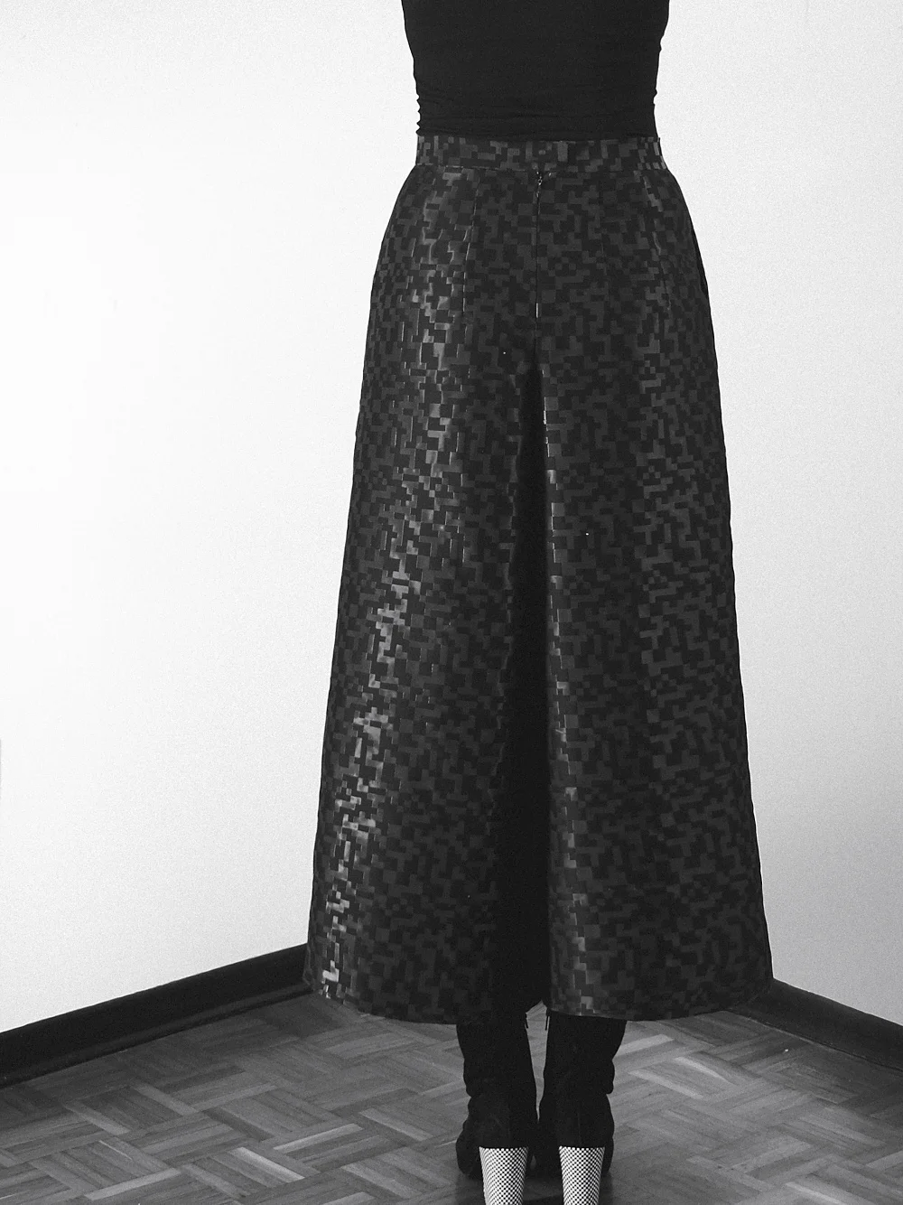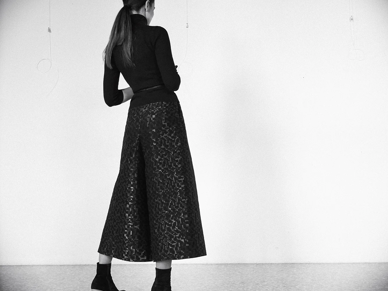 In questa mia versione (che ho battezzato “Galleria” visto che stava proprio bene nella galleria d’arte dove ho fatto le foto …) ho voluto mantenere per quanto più possibile l’aspetto di gonna tenendo però l’ampiezza al minimo (ovviamente in relazione al tessuto). Il tessuto, alquanto insolito, piuttosto rigido e con una mano croccante è gia abbastanza drammatico in se. Ho pesato che aggiungendo ampiezza avrebbe molto facilmente preso l’aspetto di un abito da ballo ottocentesco. Volevo che avesse una linea architettonica ma che si potesse comunque indossare … vabbè magari non per andare al mercato. ::::