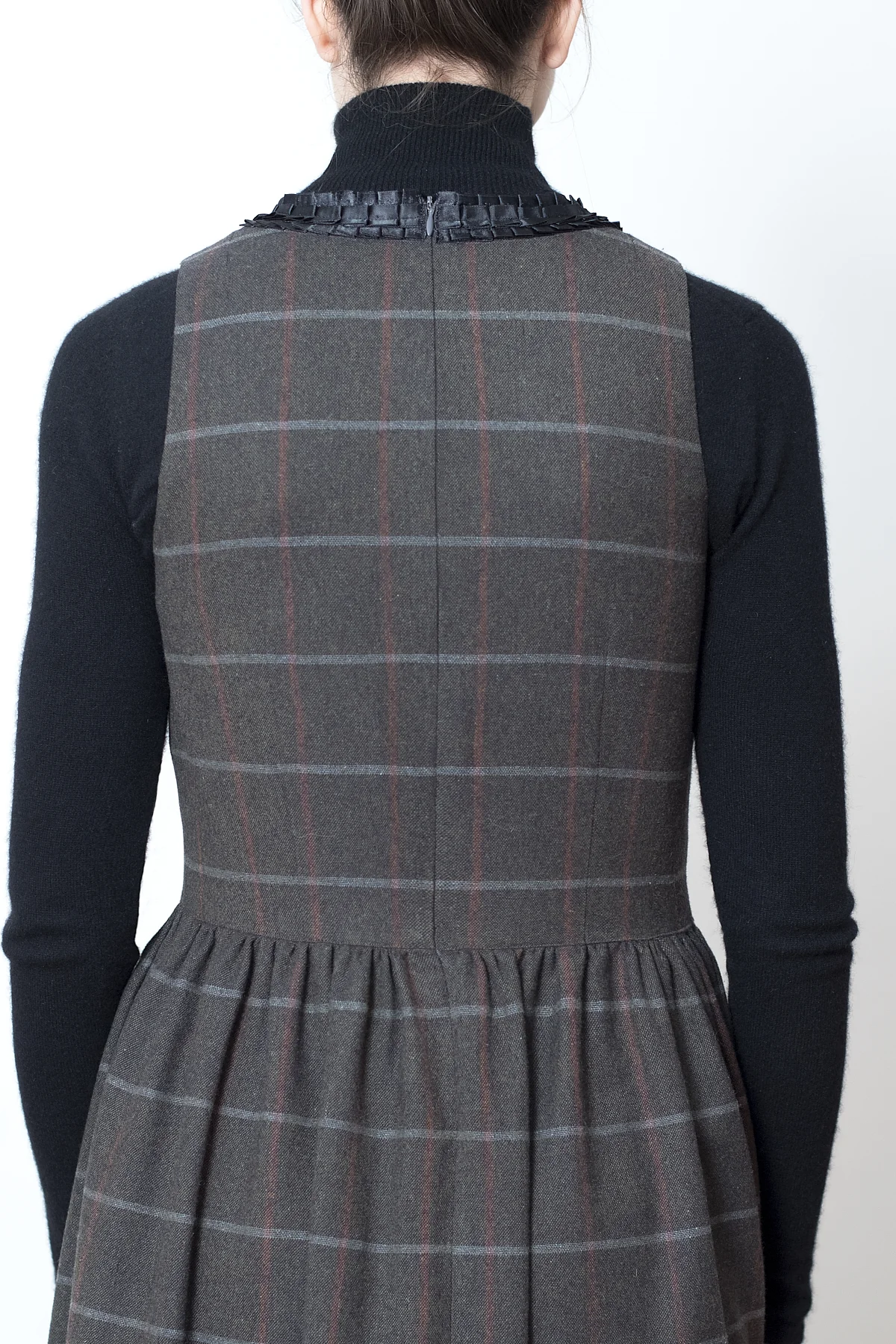Il taglio del corpetto è stato determinato per lo più dall’andamento delle linee bianche. Il davanti ha solo pince laterali seno mentre il dietro ha pince in vita e delle piccole riprese sulle spalle. Lo scollo e il giromanica sono rifiniti con paramonture inserite nella fodera (vedi immagine). Ho usato una fodera leggerissima che si estende fino a 2 cm sotto la cucitura del volant con una gonna a un terzo di ruota. Visto che la lana non drappeggerà mai come il seersucker in misto qualcosa (boh?!), per darle un movimento un po più carino, ho inserito catena peso tra il corpo della gonna e il volant.::::