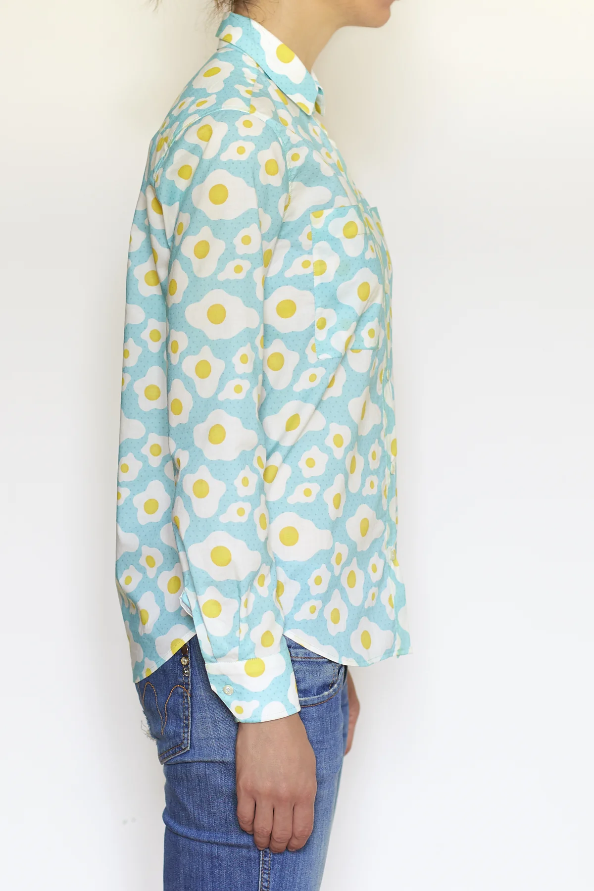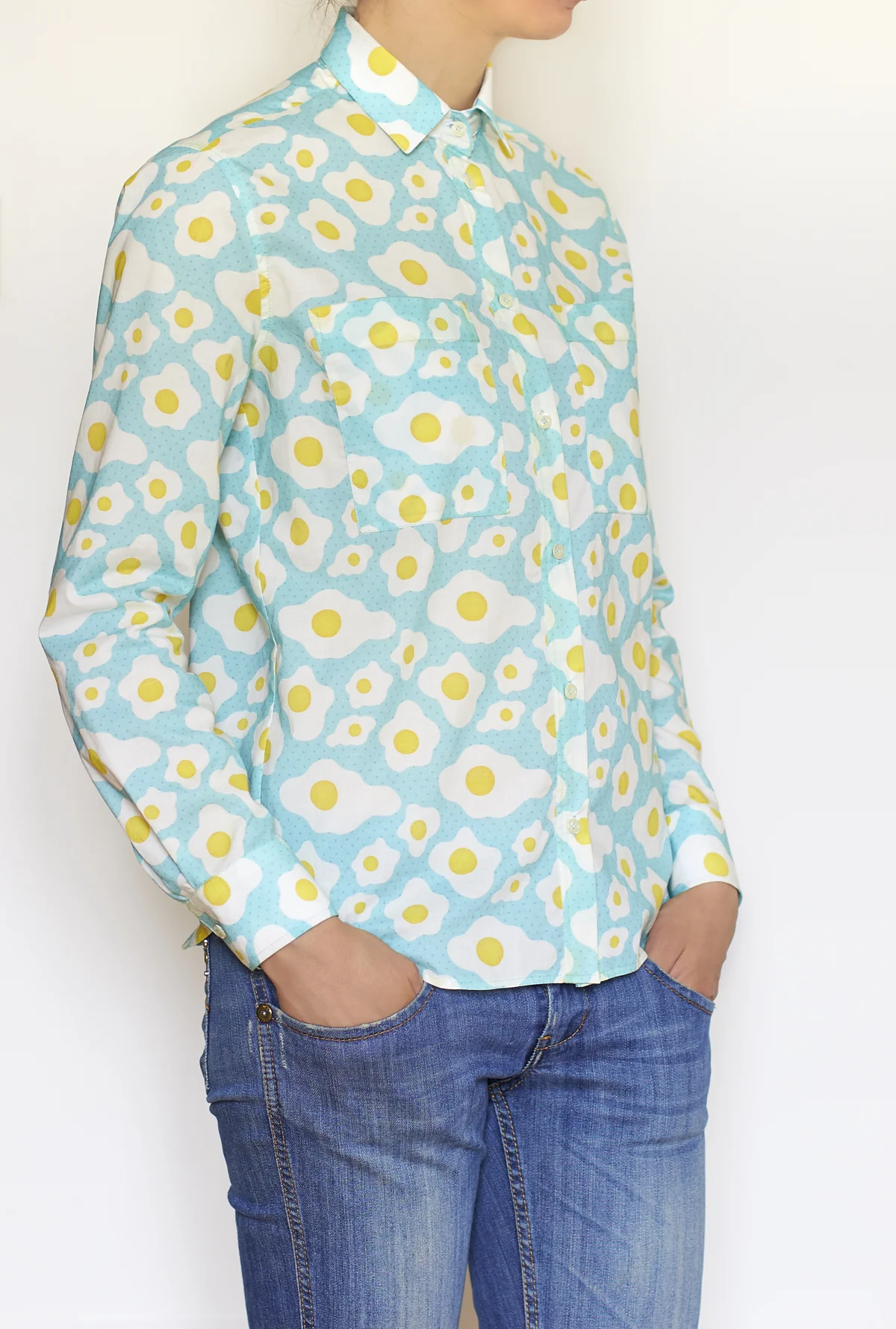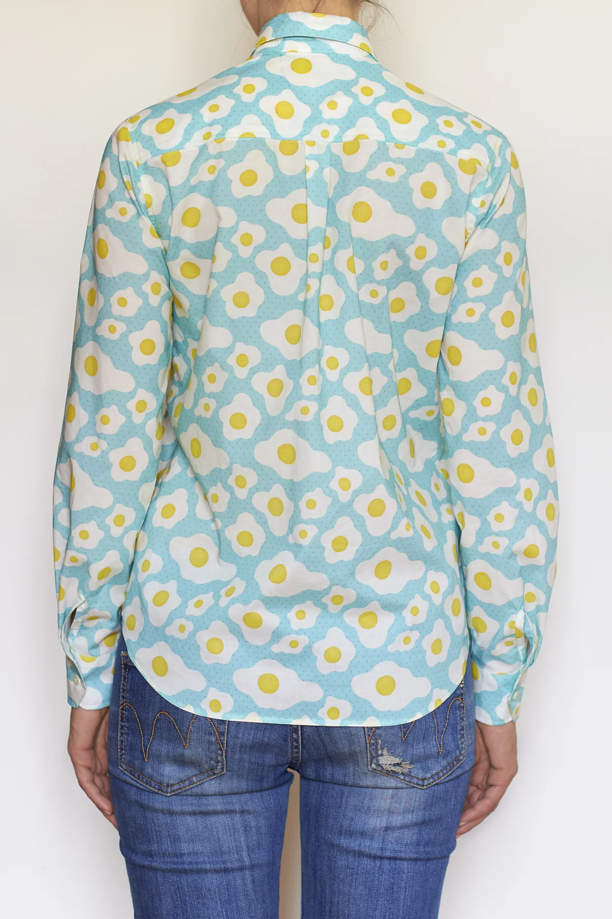 Io adoro le camicie e siccome l’offerta un po' stantia di tessuti per la camiceria presente nei negozi della mia zona non mi ha mai fatto esattamente gola, quando mi sono messa a sfogliare il catalogo di Spoonflower sapevo di essere alla ricerca di un qualcosa di colorato, originale e divertente che difficilmente avrei trovato nei negozi. Ed eccolo qua: un design conuova e bacon! Il colore del bacon però, sembrava creasse un po’ troppo contrasto. Ho mandato un messaggio alla designer che si chiama Anya e vive in Siberia(!), domandandoli se era possibile editare il disegno e togliere il bacon. Mi ha risposto subito di sì ed entro poco tempo mi ha inviato il link al nuovo disegno!