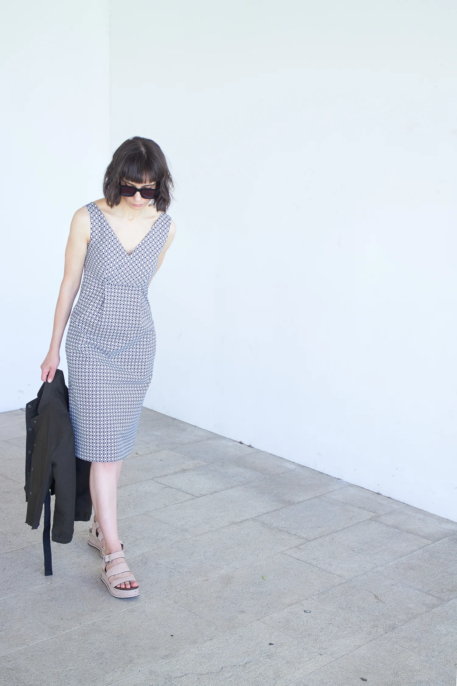 I cut a size 72 (the smallest in the tall range) as per my bust measurement. For the hip, I knew I had to go one size up but there was enough ease in the pattern and I had stretch fabric – so I didn't. What I did was to reduce the bodice by 1cm both on CF and CB (and adjusted the skirt "waist to match by taking it in at the sides): I have a very narrow ribcage and I was using stretch fabric; besides, this type of dresses look better if they're well fitted around the bust. This is the only adjustment I did on the pattern.